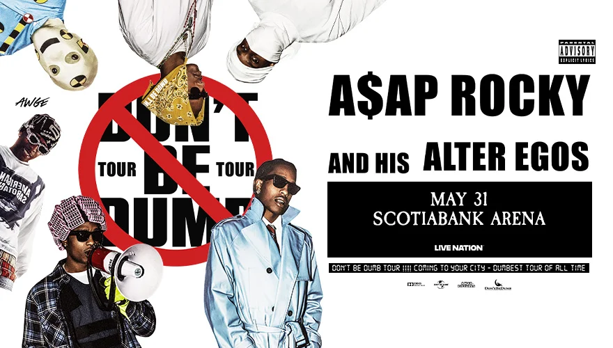 A$AP Rocky at Scotiabank Arena, high-production arena rap with fashion-forward visuals and a setlist that spans his full discography. His shows tend to move fast, mixing crowd favourites with new material from Don’t Be Dumb. This one will go quickly; don’t sit on tickets.