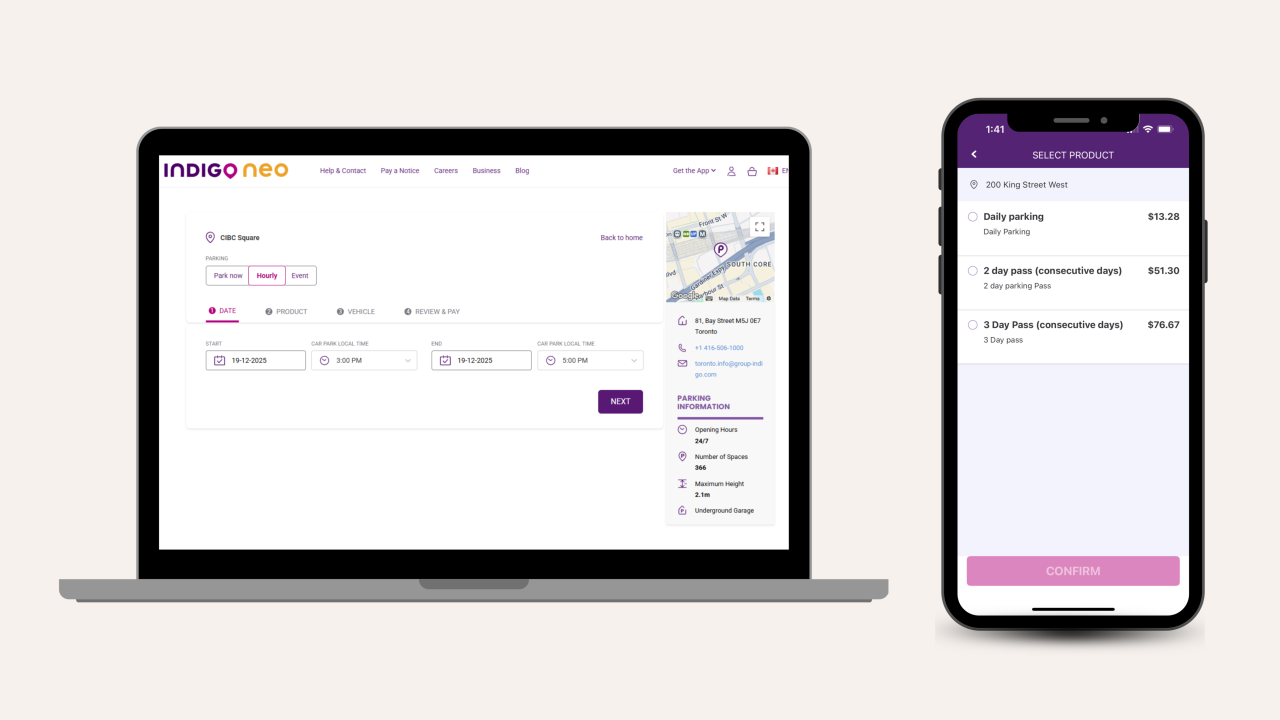 Download the app or visit indigoneo.ca today and turn parking into one less thing to worry about.
